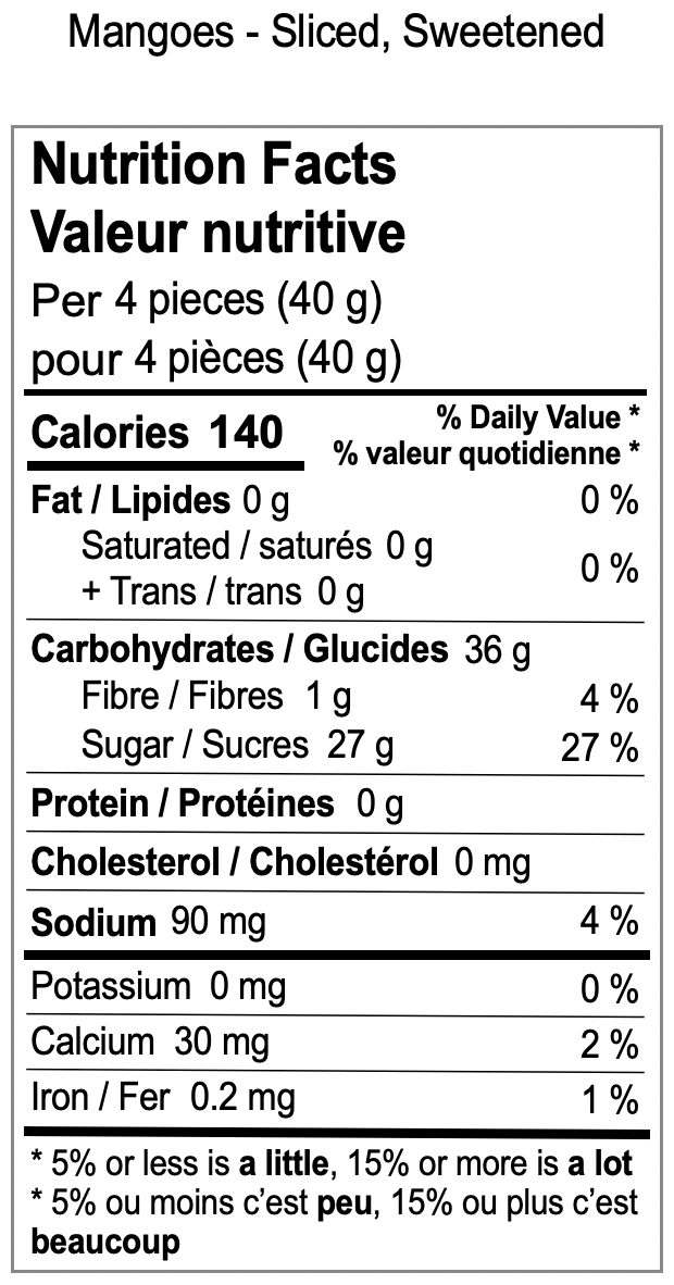 Mangos, Cane Sugar, Citric Acid, Calcium Chloride, Sulphites added as preservative. Contains: Sulphites.