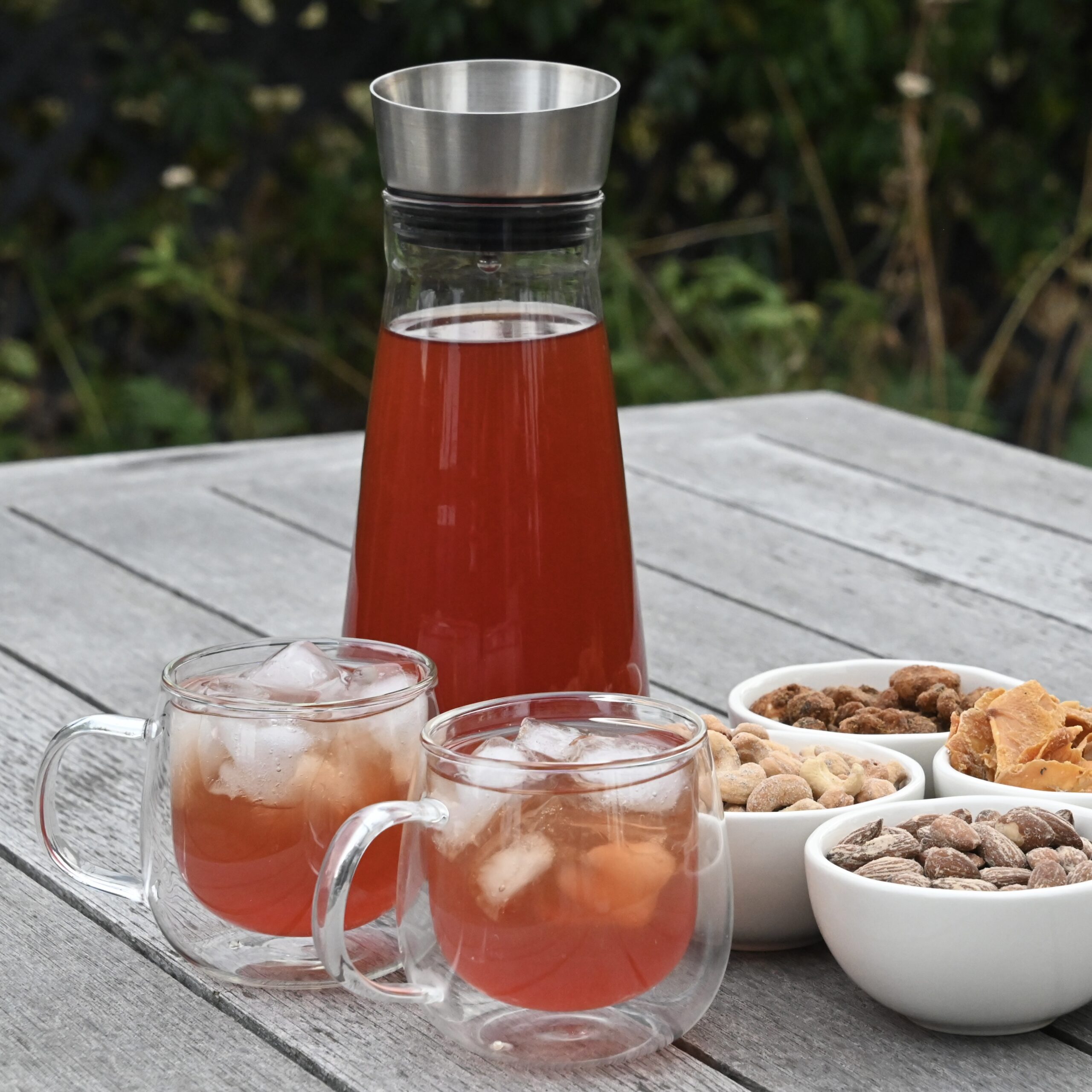 Once your tea is fully chilled, strain out the Tea and Dried Fruit and transfer to a carafe.
