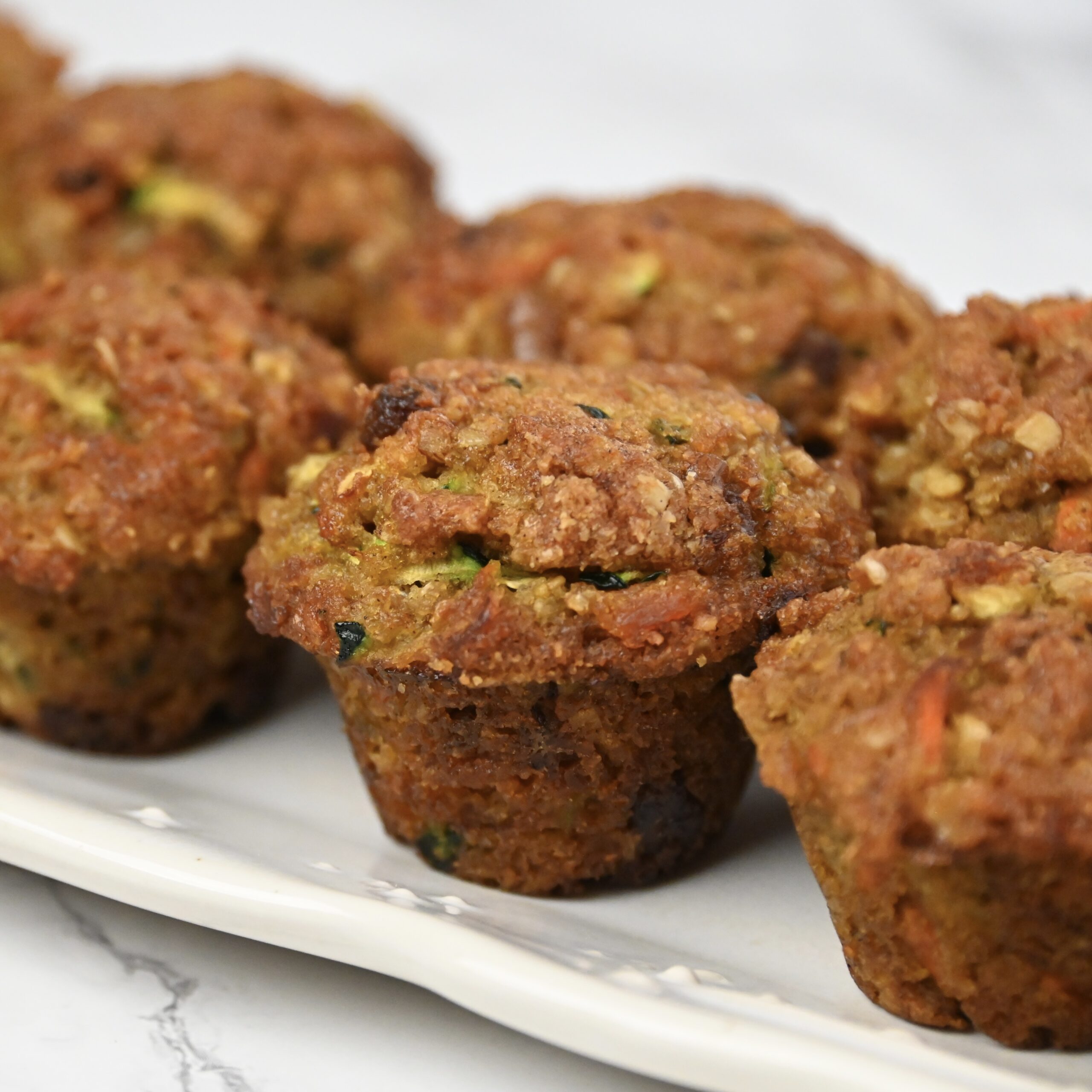 In a separate bowl, combine Eggs, Zucchini, Carrot, Oil, Maple Syrup and Vanilla. Add to the dry ingredients and stir